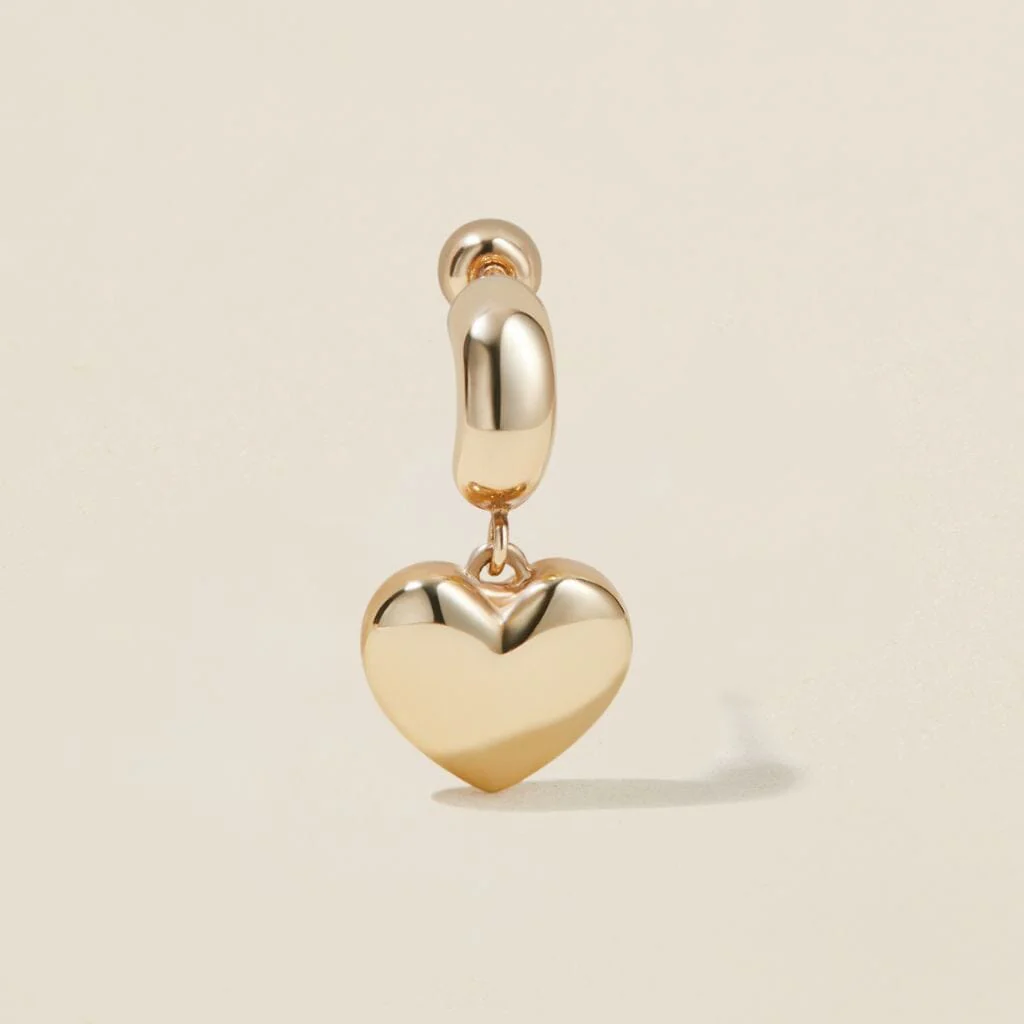 What a charmer! Bug’s chubby heart charm piercing, uniquely combines a hoop and externally threaded piercing post for every day comfort. A subtle statement design, you’ll want one for each lobe. Created for you in the finest 14 karat gold, you'll want to wear this piercing always and never take it off, even when working out or in the shower.