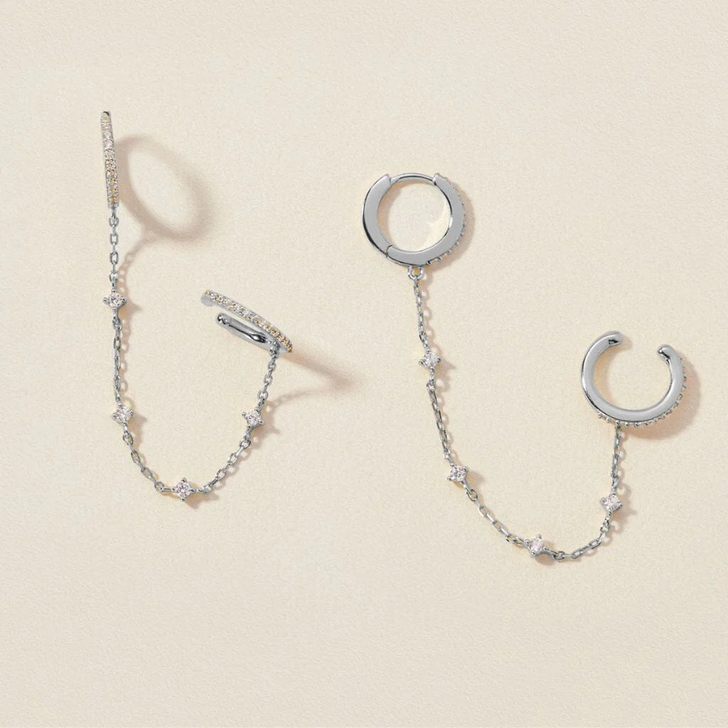 You asked, we listened. Due to popular demand, our bestselling solid gold Luke single earring is now available as a pair. Olsen's crystal-lined chain connects an ear cuff and huggie earring, requiring only one piercing for each earring. Something tells us this cuff and huggie earrings are going to be worn on repeat this season. Created for you with a sterling silver base and utilizing an extra luxurious rhodium plating, this earring set is everything you love about our demi-fine jewelry collection.